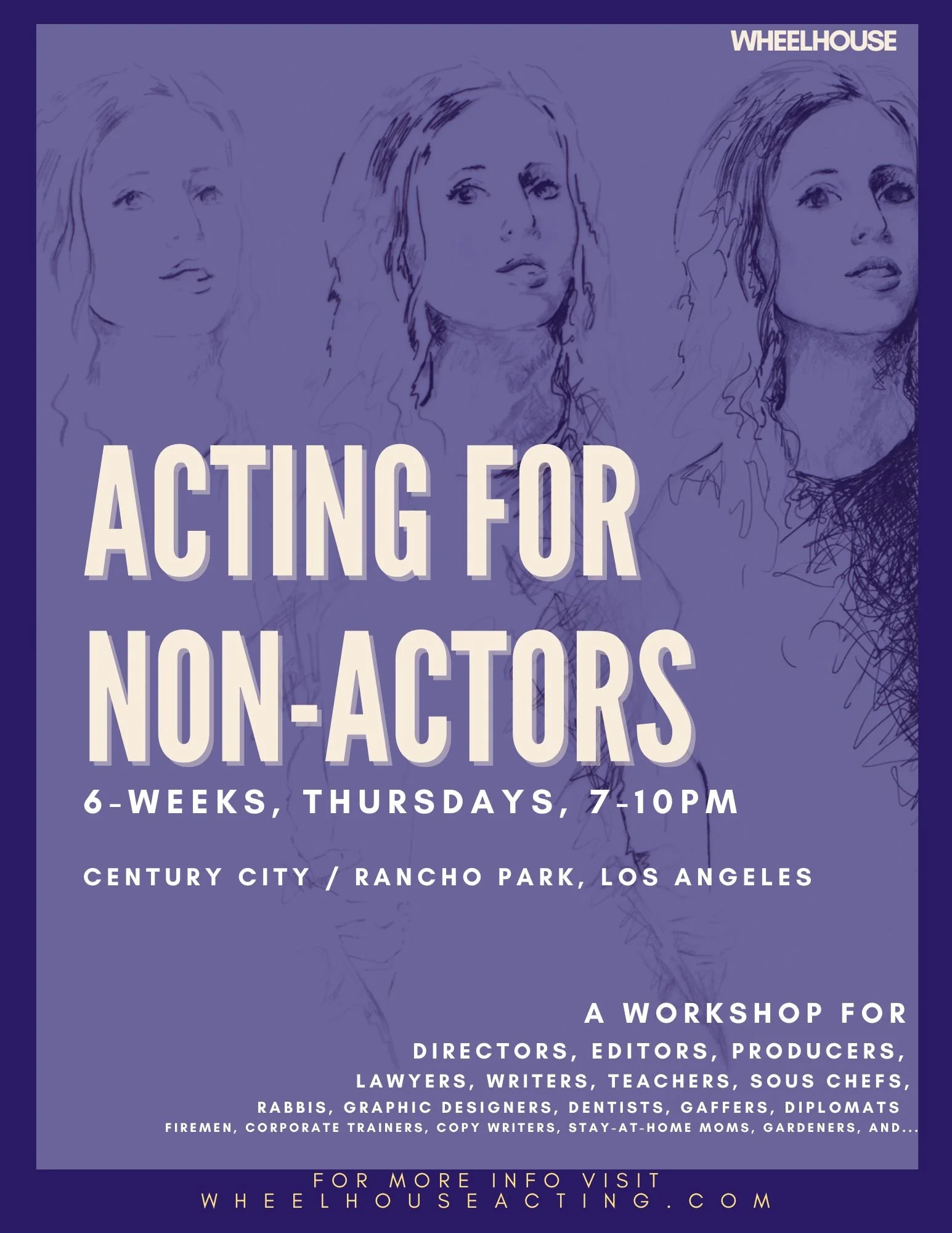 The workshop is from 7-10pm on Thursday and runs for six weeks. We meet at The Pico, a lovely theater complex in the Rancho Park area of LA ( just SW of Century City). Click here for upcoming classes.